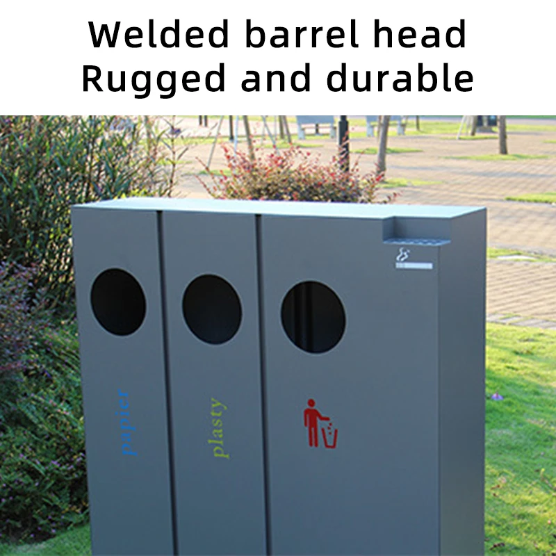 Designed specifically for high-traffic public and commercial areas, this metal trash can supports waste segregation protocols in venues such as airports, university campuses, shopping centers, and government buildings. By providing clearly demarcated compartments for sorting, it helps institutions comply with environmental regulations and achieve sustainability targets. Integration into outdoor facility management systems enhances operational workflows, user engagement with recycling programs, and overall cleanliness standards in busy urban environments.
