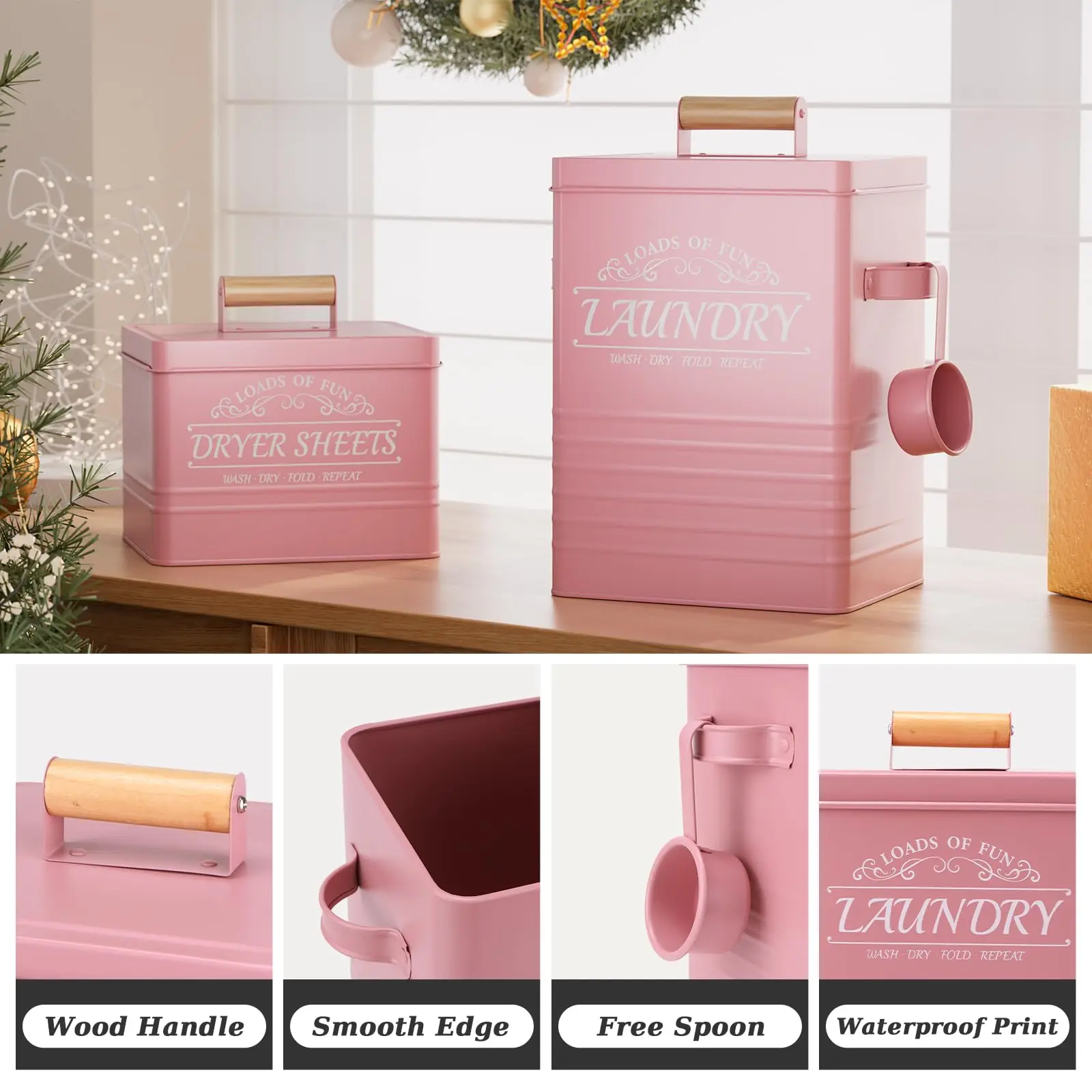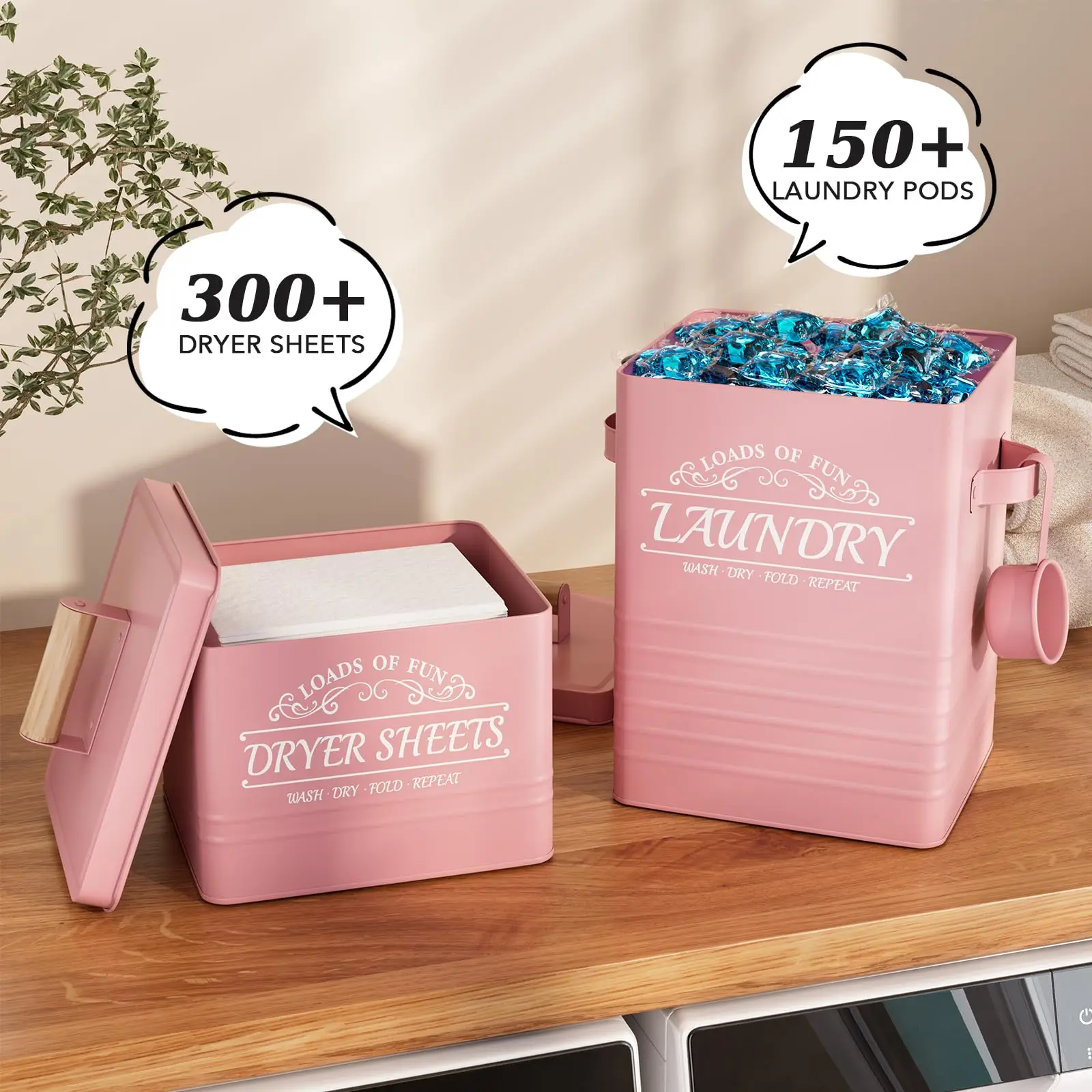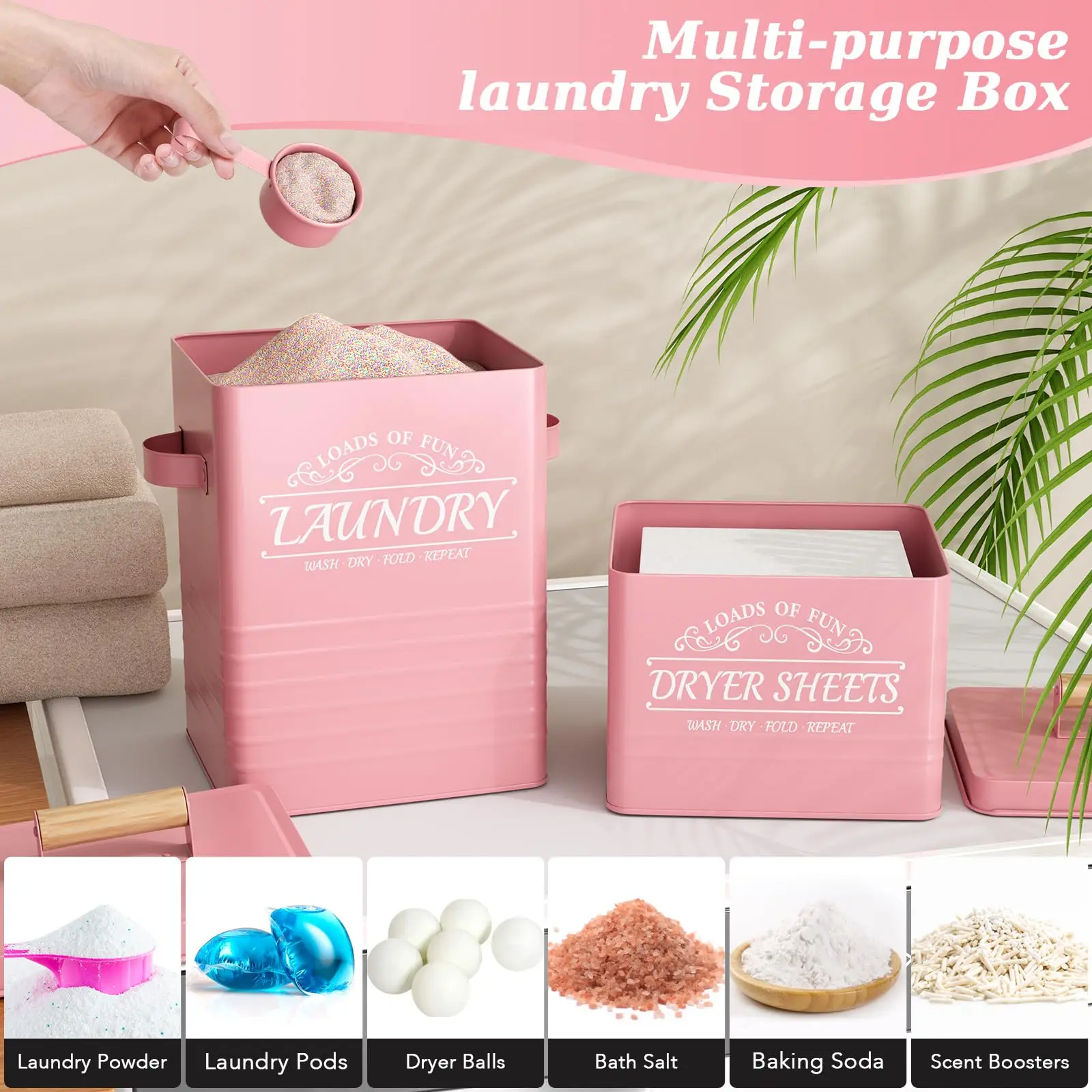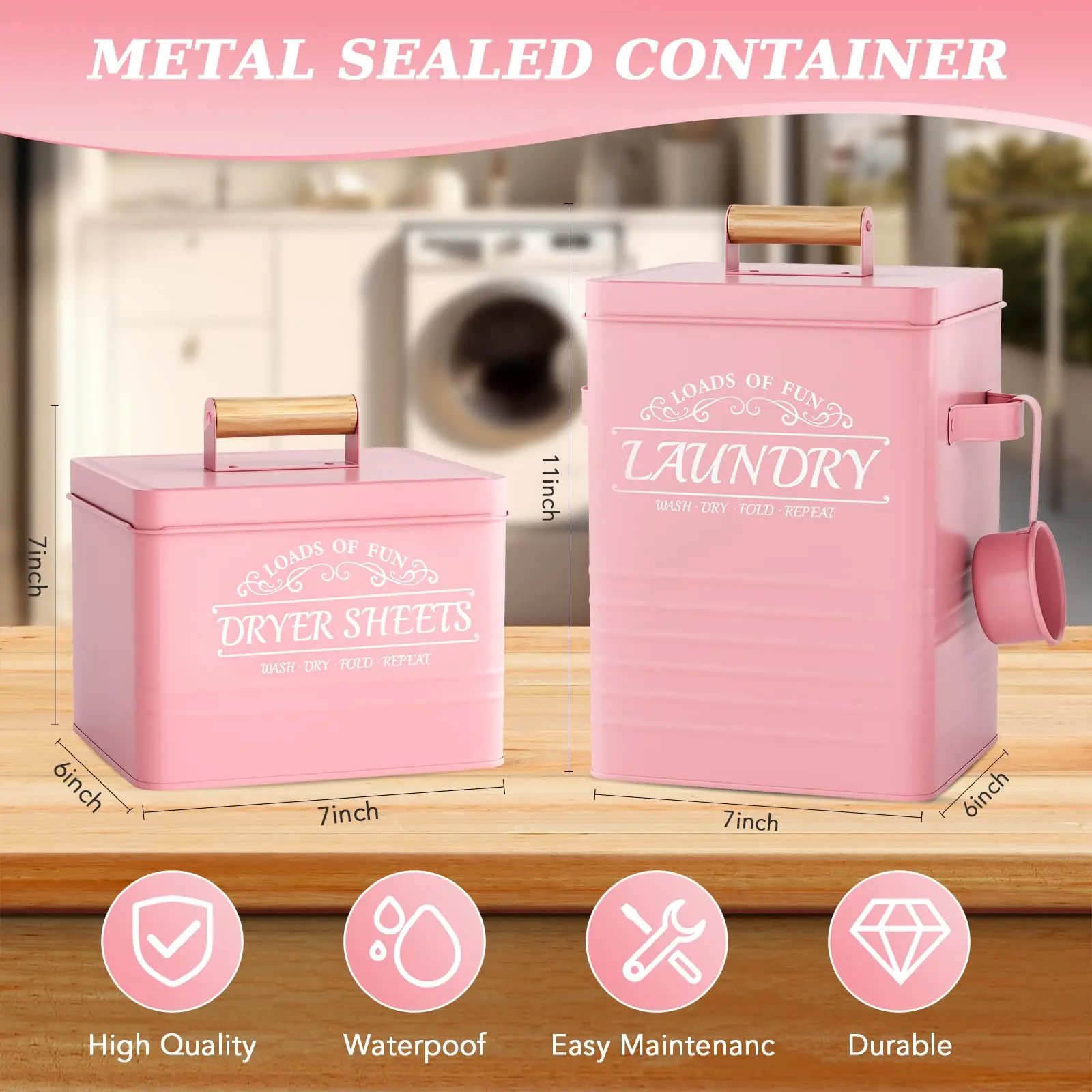 Transform your laundry room organization with our elegant Farmhouse Style Metal Laundry Storage Set. This versatile set, crafted from high-quality galvanized iron, is designed to keep your laundry essentials like washing powder and dryer sheets neatly stored and easily accessible. The inclusion of a dedicated scoop ensures precise measuring, reducing waste and keeping your space tidy