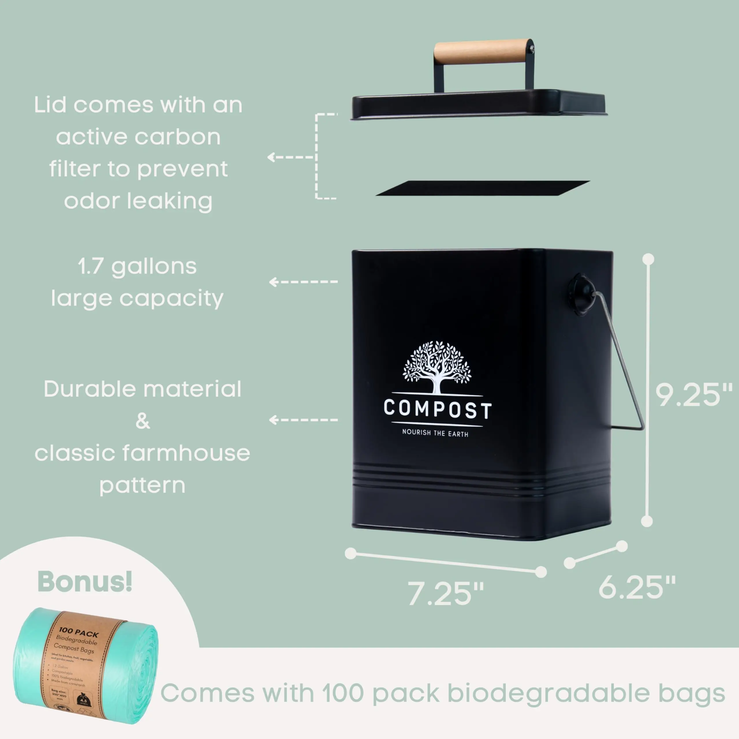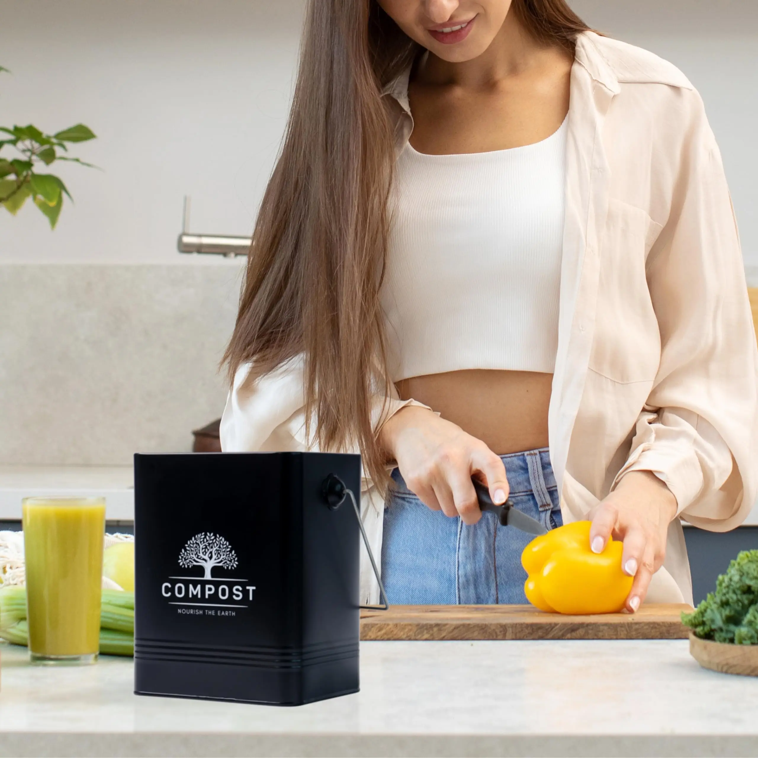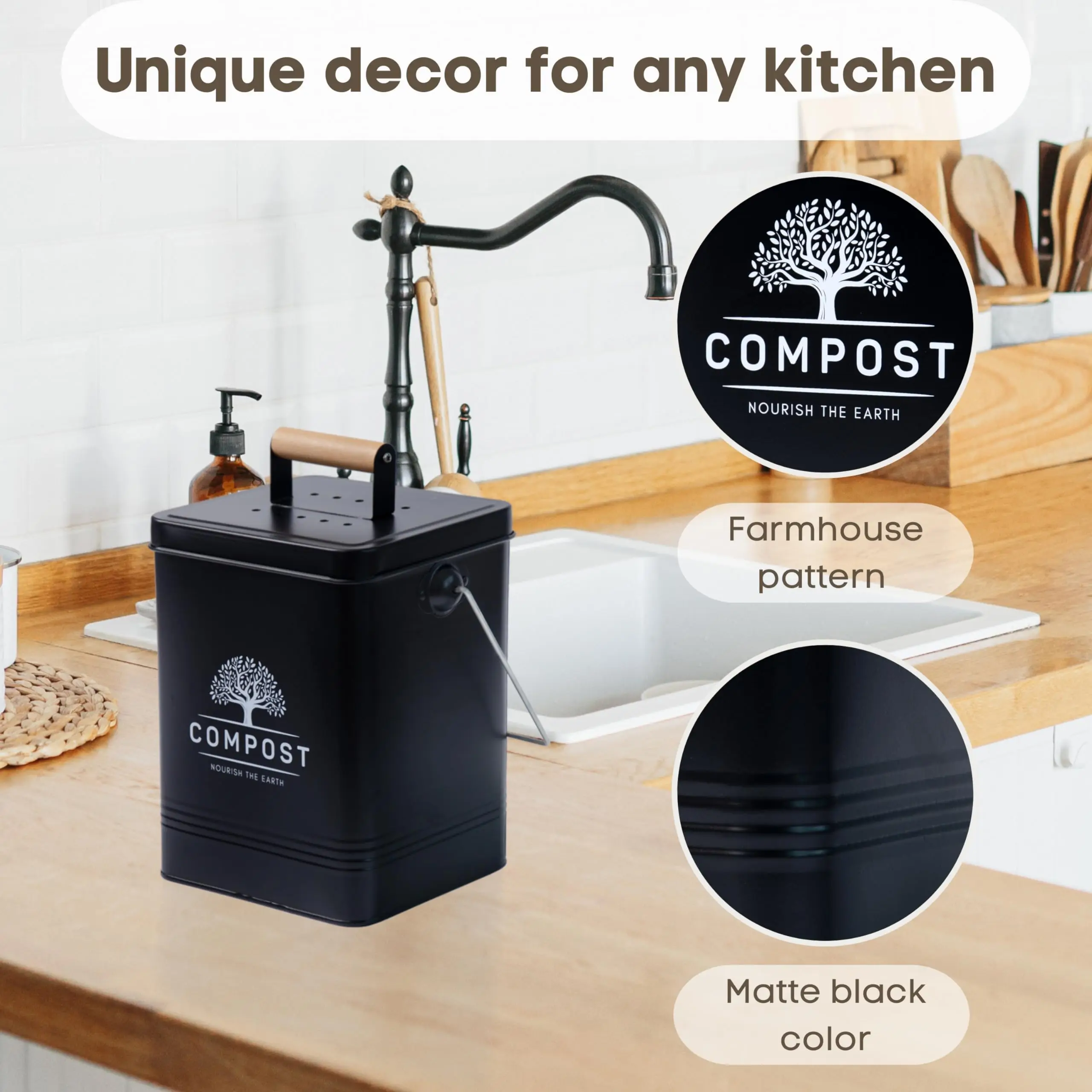 This custom metal compost bin (model T170) is designed for kitchen countertop use, with a 1.7-gallon (6L) capacity and a modern luxury style. Made from galvanized iron with a round shape, The eco-friendly bin includes a lid and supports customized colors, sizes, and logos. It is ideal for storing food waste like fruit/vegetable scraps, coffee grounds, and eggshells.