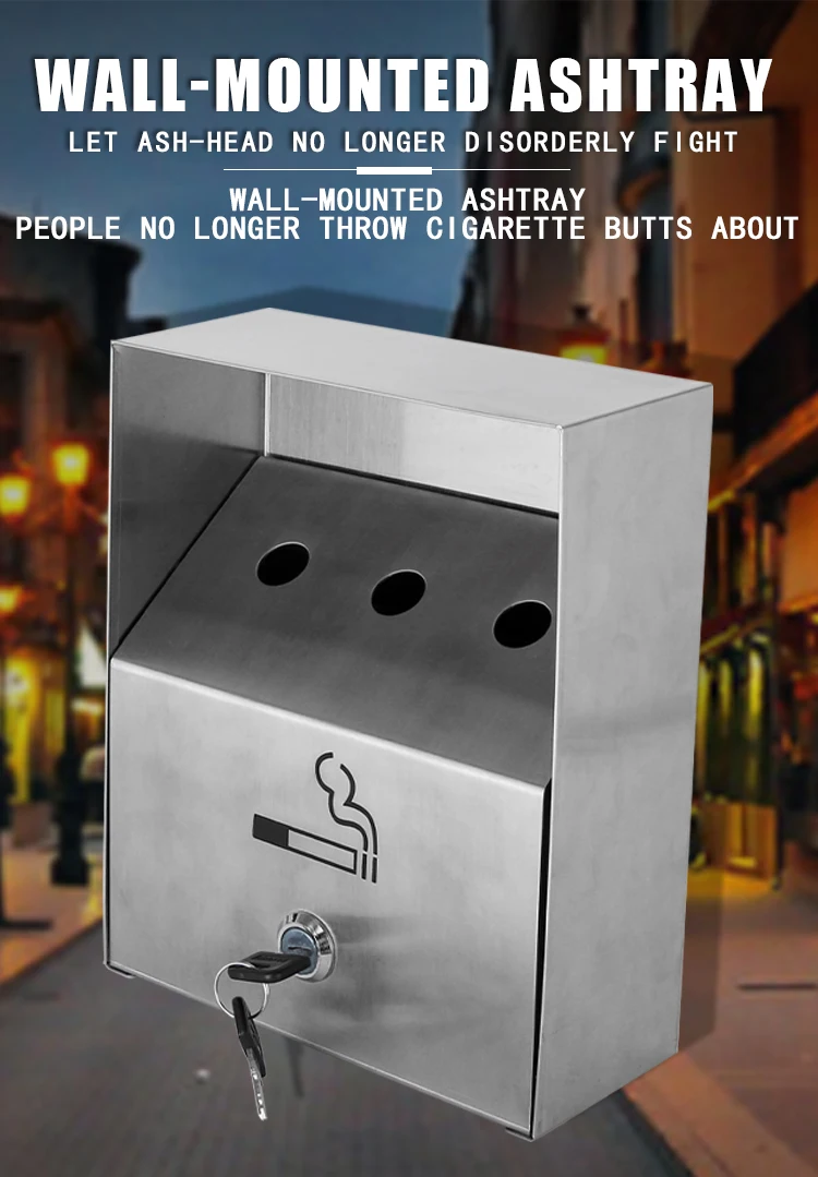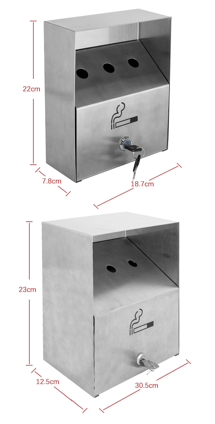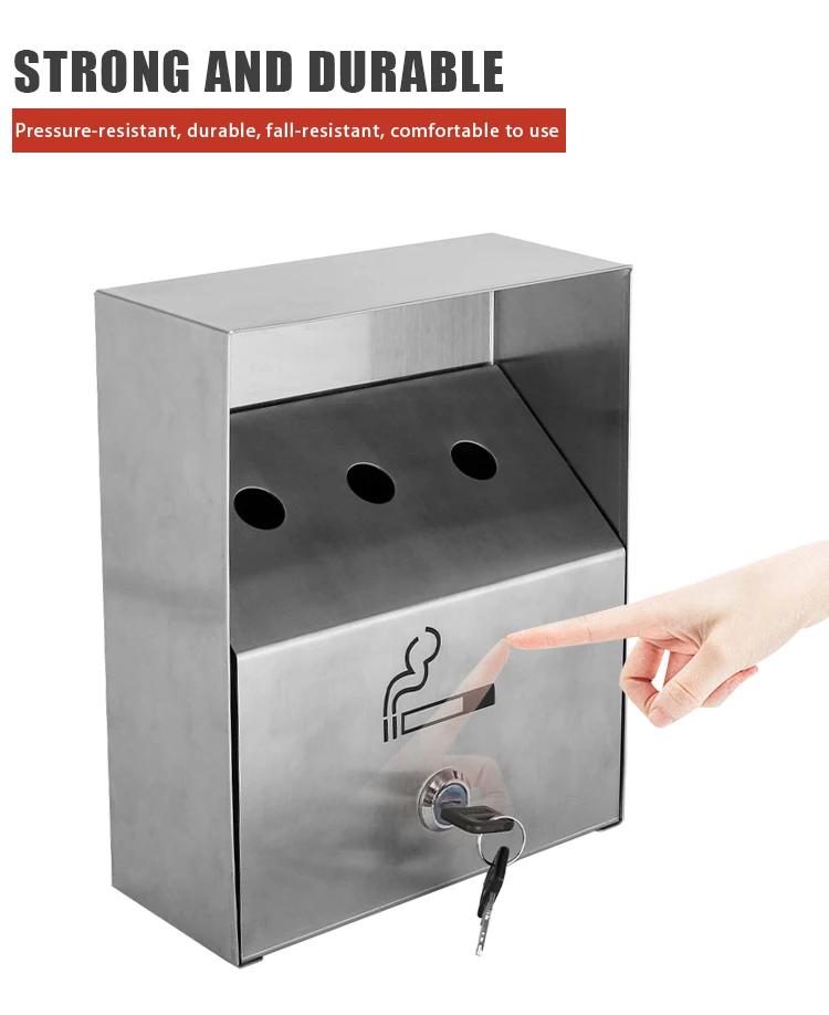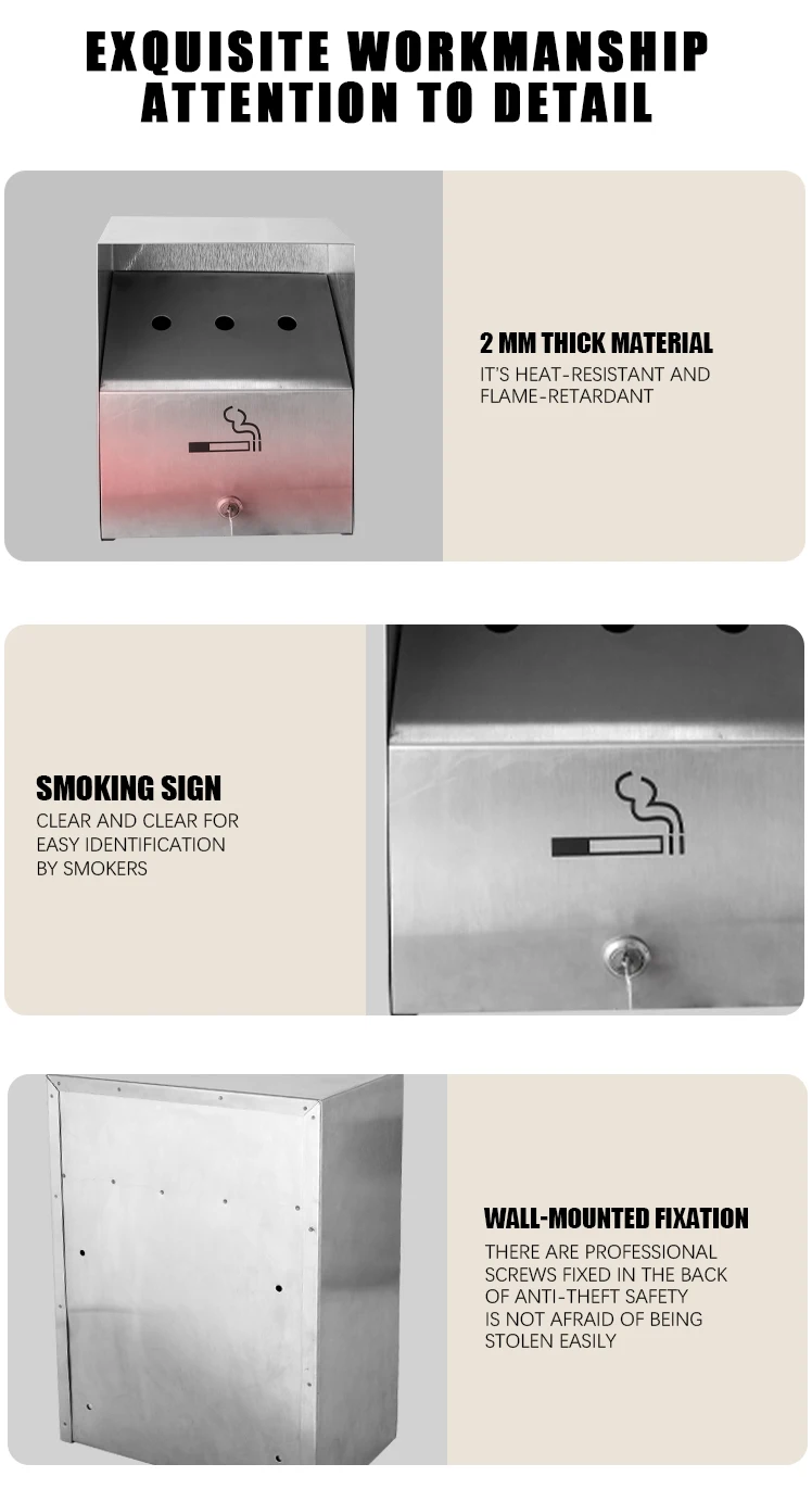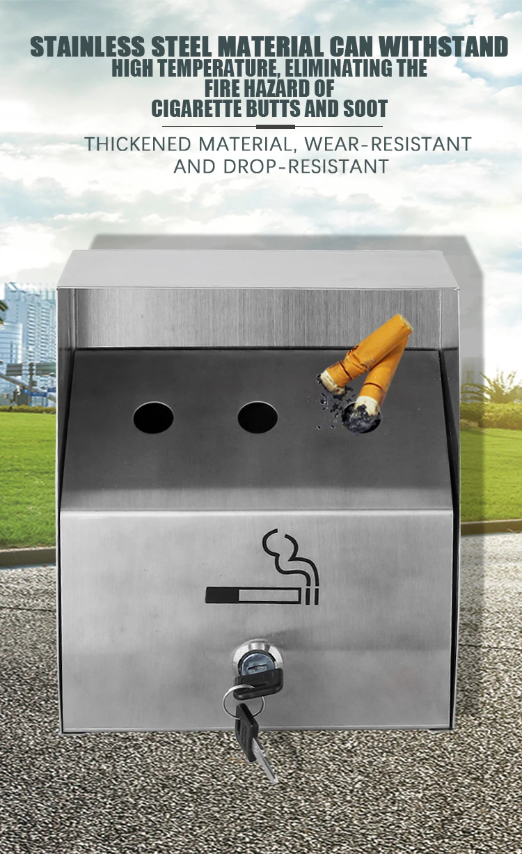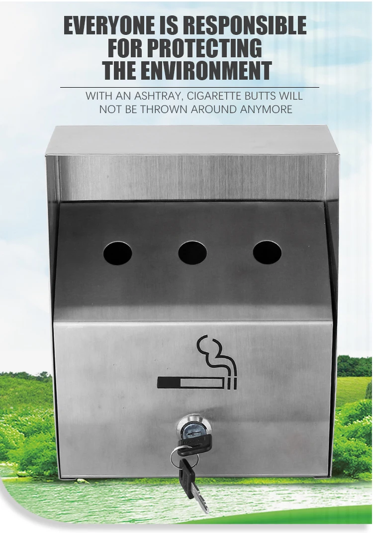 A robust, wall-mounted stainless steel cigarette bin with a square design, ideal for outdoor use in hotels and restaurants. Features a classic style, lockable or secure structure, and available in mirror or satin finishes. Custom colors and logos are supported for branding flexibility.