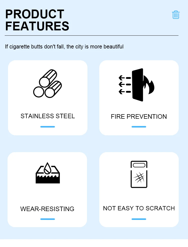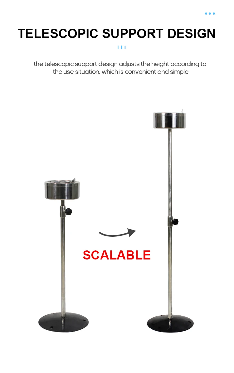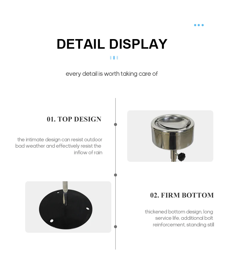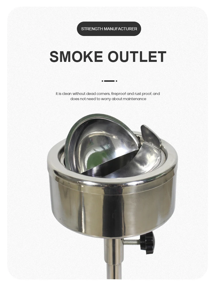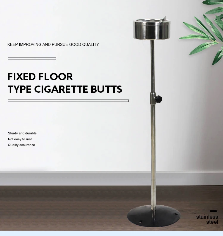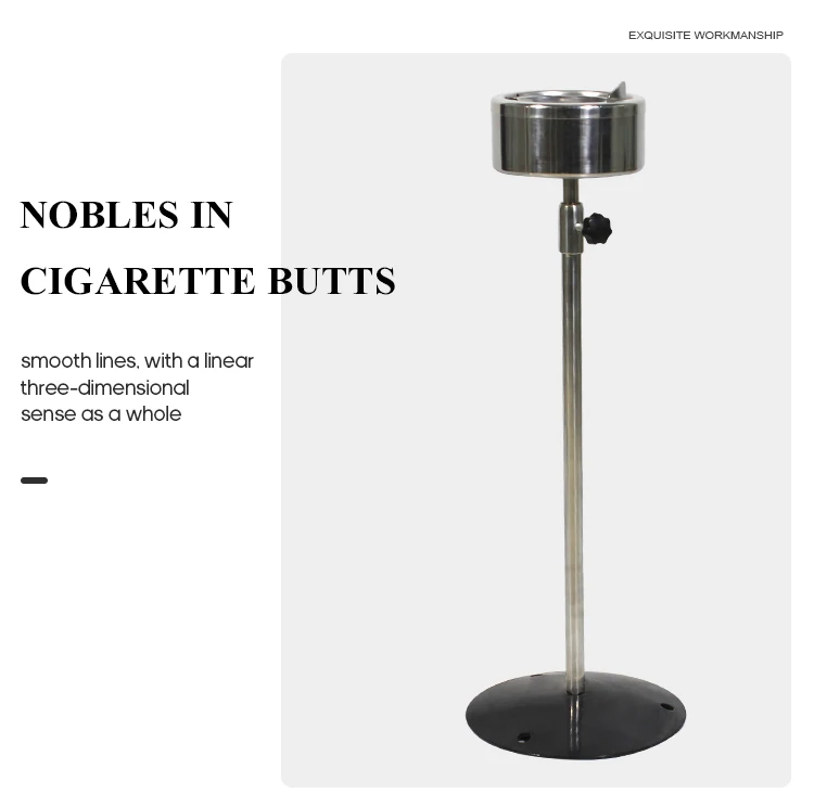A durable and elegant floor-standing ashtray made of 304 stainless steel with a adjustable height stand, suitable for both indoor and outdoor use in hotels, lobbies, patios, and public smoking areas. Customizable color available.