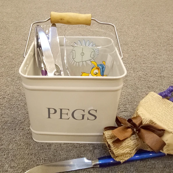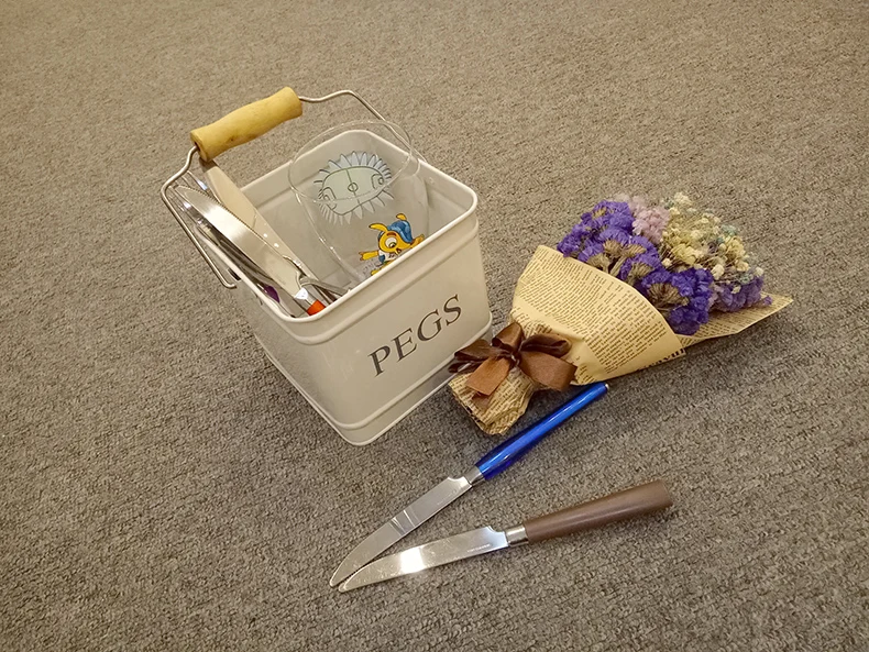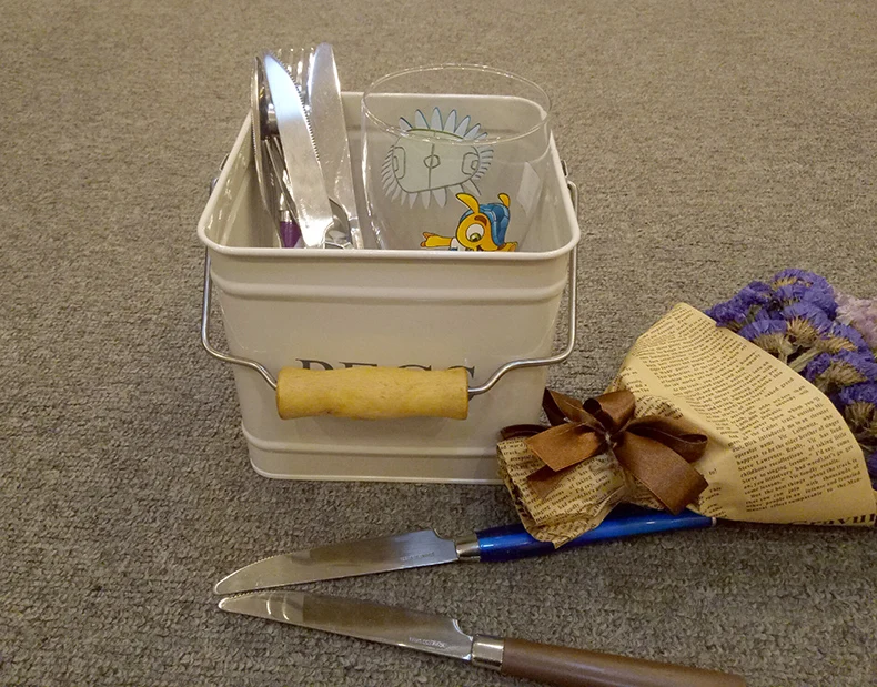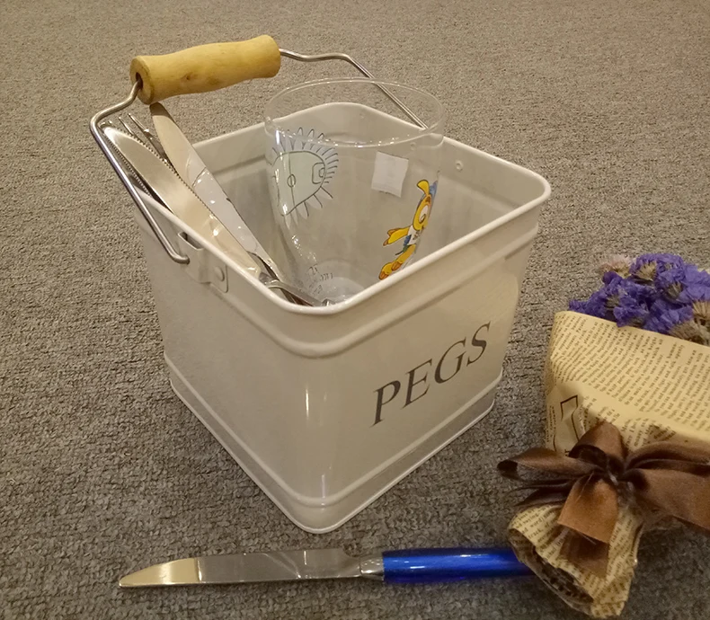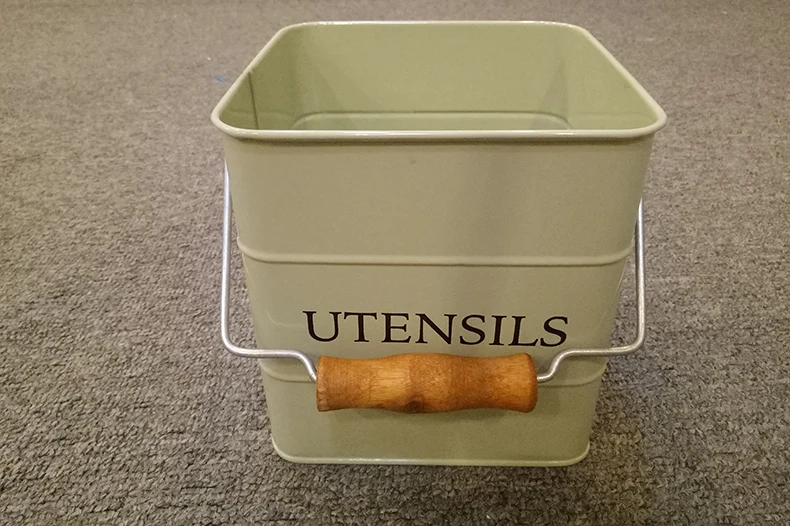 galvanized iron kitchen decor cutlery holder with wooden handle square storage bin 3.5L powder coating metal utensils caddy