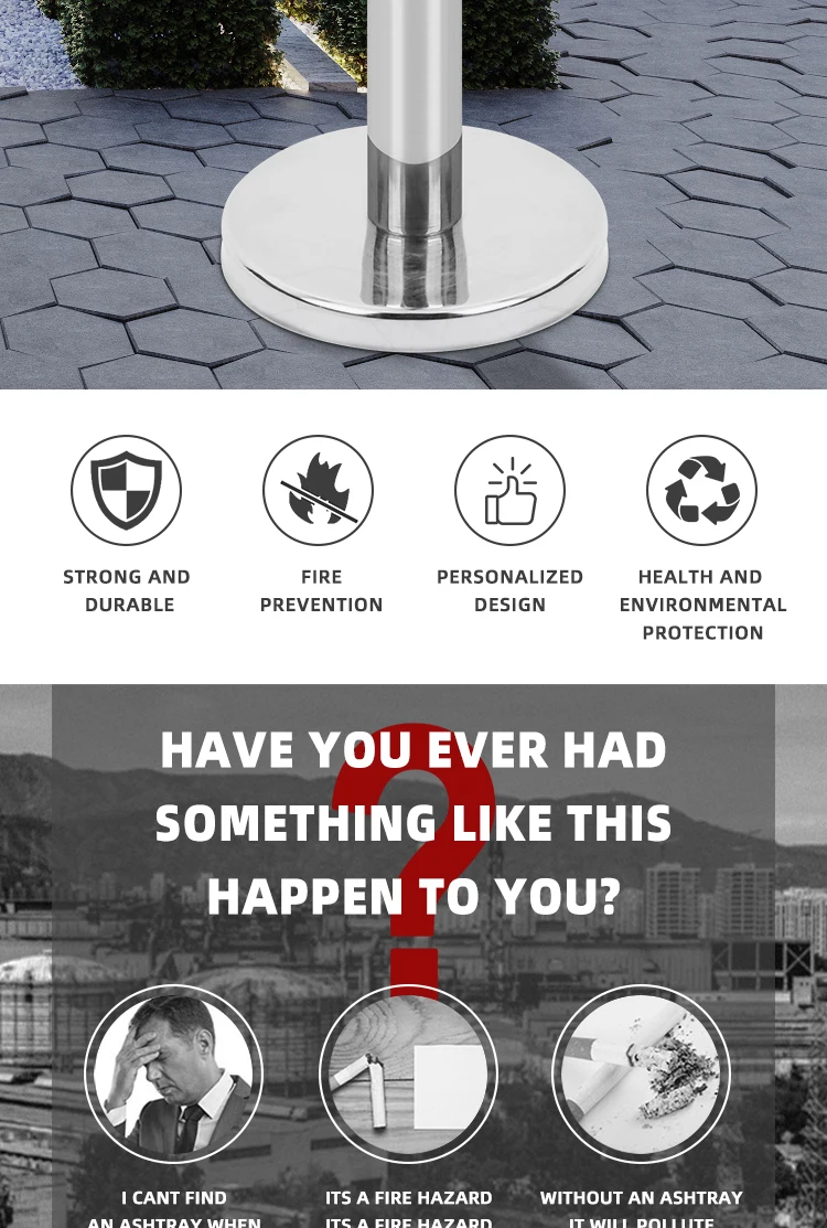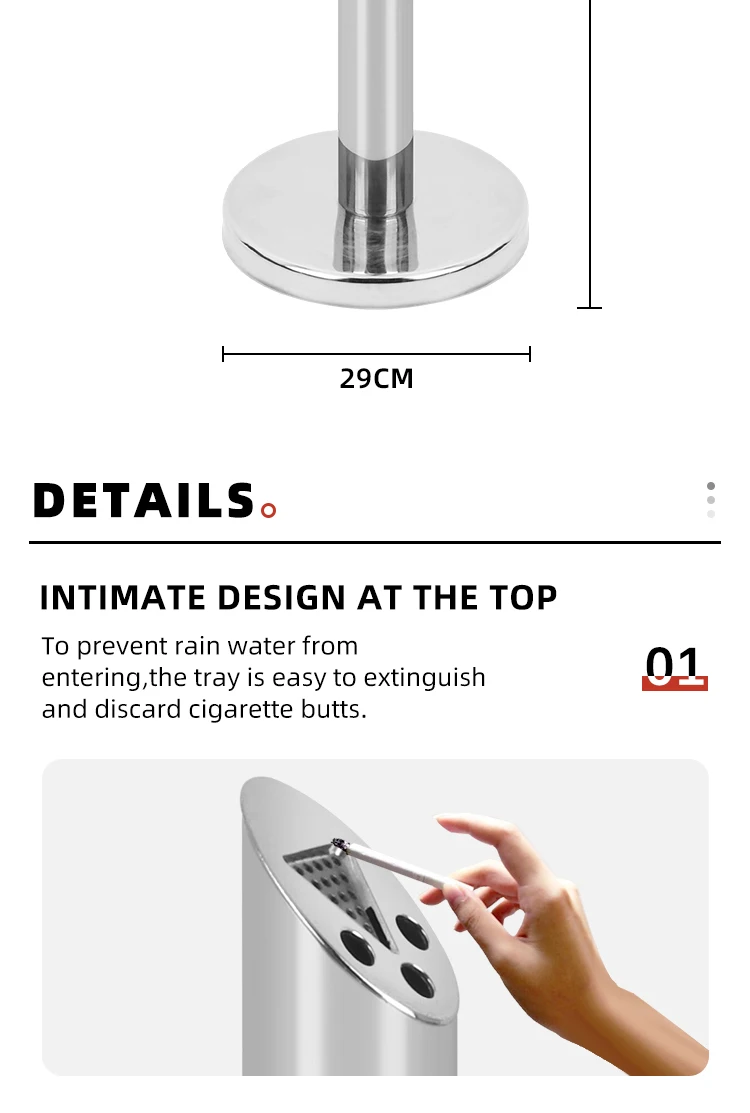 Eco-friendly outdoor standing ashtray made of high-quality stainless steel with a modern round design. Perfect for streets, hotels, and public spaces. Features a durable build and customizable surface finishes—mirror, satin,with optional logo personalization.