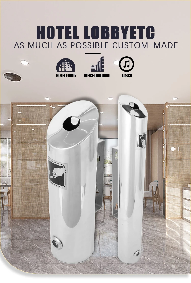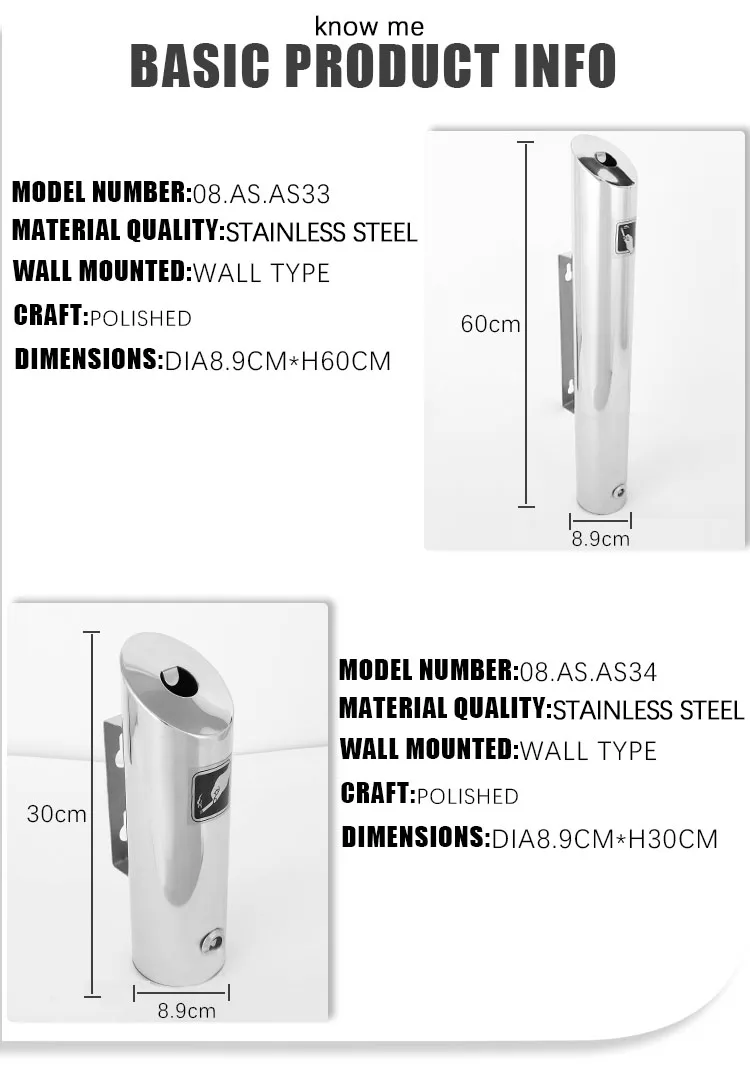 The SUNLIGHT AS033/AS034 Wall-Mounted Outdoor Ashtray is a classic, round stainless steel cigarette butt receptacle designed for commercial use in hotels and public areas. Featuring a durable build with mirror or satin surface finishes, it includes a secure wall-mounted design and supports customized color and logo options for seamless brand integration.