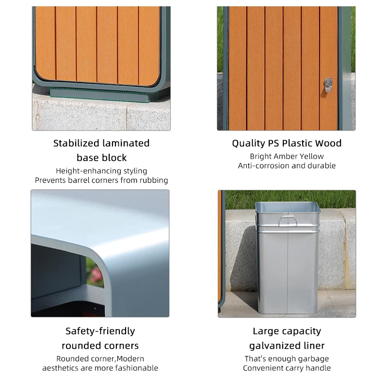 Operational efficiency is amplified by the SS106’s lightweight peel box bucket, simplifying onsite waste handling and decreasing downtime. The corrosion-resistant metal trash can body ensures longevity, significantly reducing replacement frequency and associated costs. Designed for ergonomic use by maintenance personnel, it complies with health and safety standards, supporting smooth workflow integration. The trash can’s aesthetic balance of metal and wood-like elements contributes to maintaining a tidy, welcoming environment, increasing user compliance with waste disposal protocols in outdoor trash can applications.