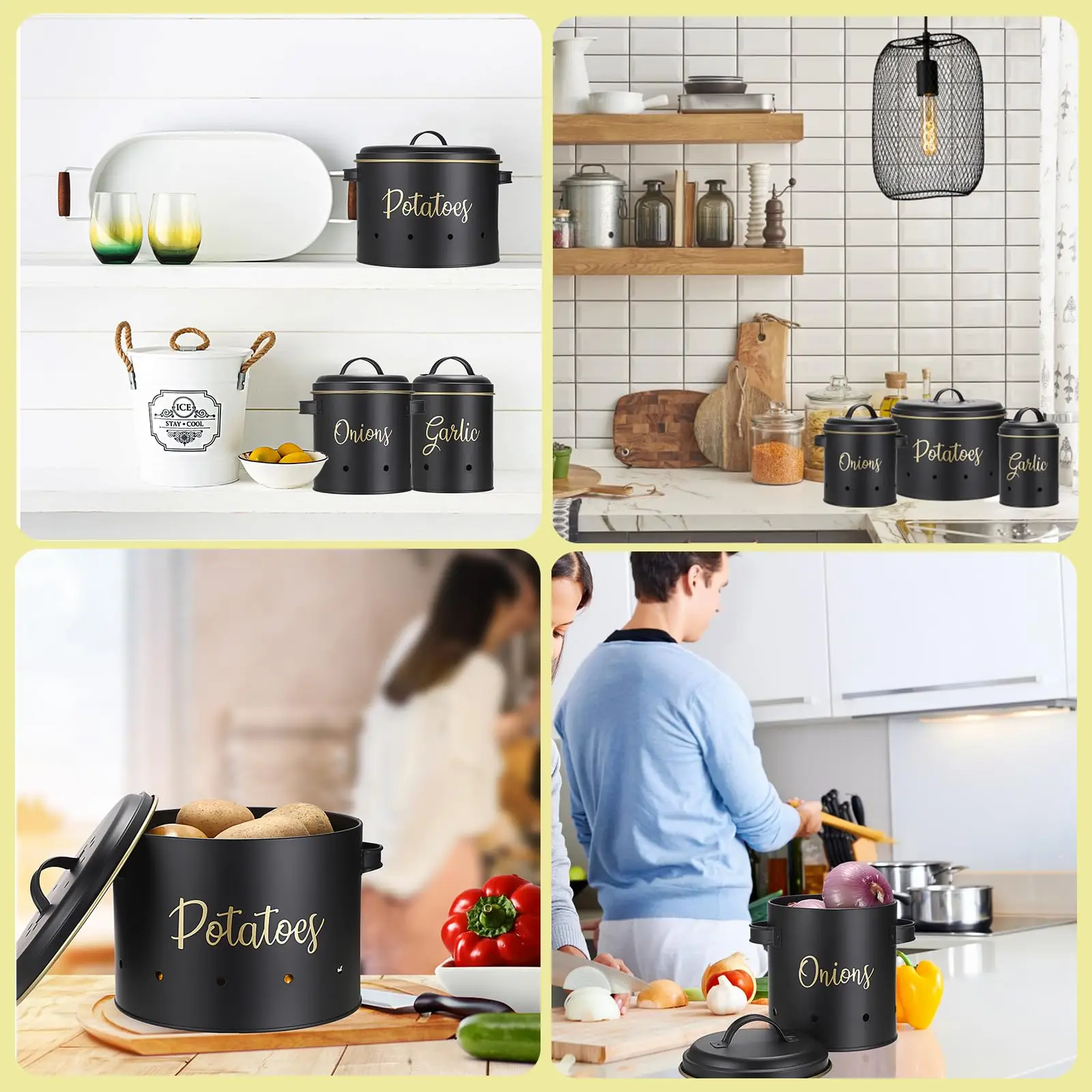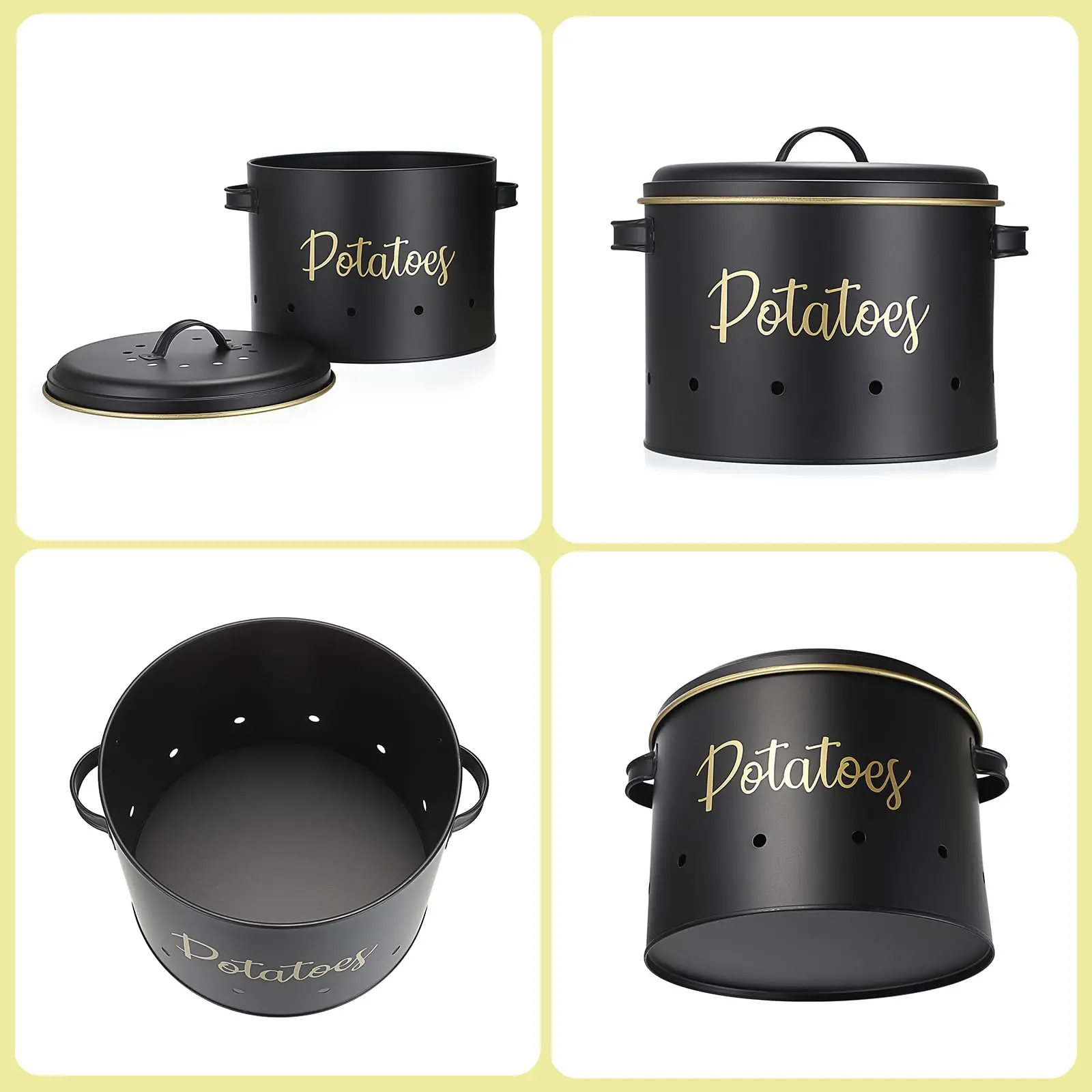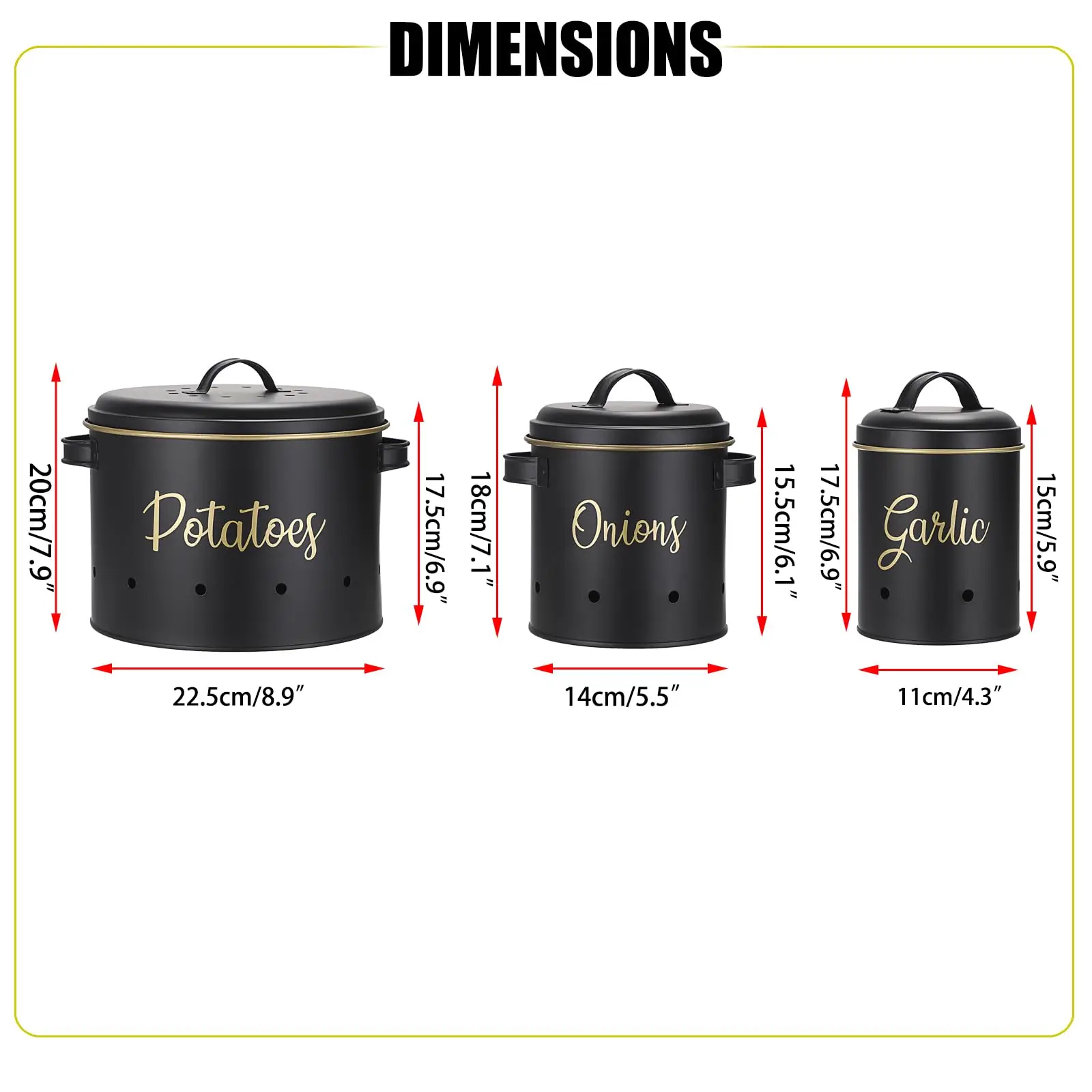 This elegant set of 3 round storage bins is expertly designed for keeping potatoes, onions, and garlic fresh and organized in your kitchen. Crafted from high-quality galvanized iron, each container features ventilation to promote airflow, extending the freshness of your produce. The set includes three sizes (11x14.5H cm, 16x19H cm, 23.5x23.5H cm) with a capacity of 1-6L, making it ideal for separate storage of different vegetables. Its eco-friendly, multifunctional design is perfect for any kitchen countertop or pantry, combining practicality with a stylish aesthetic. As a factory-direct product, it offers customizable colors, sizes, and logos to meet specific needs