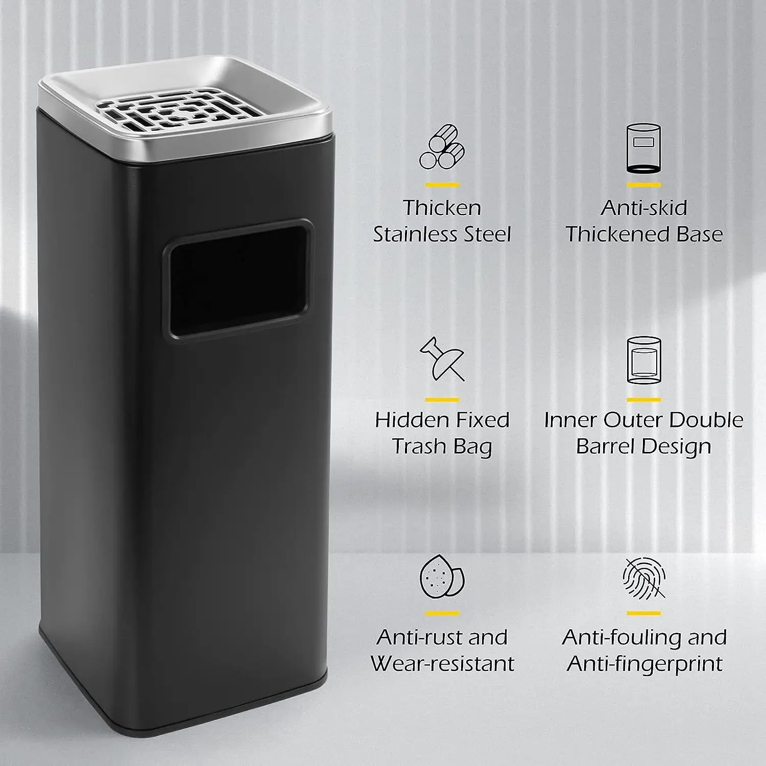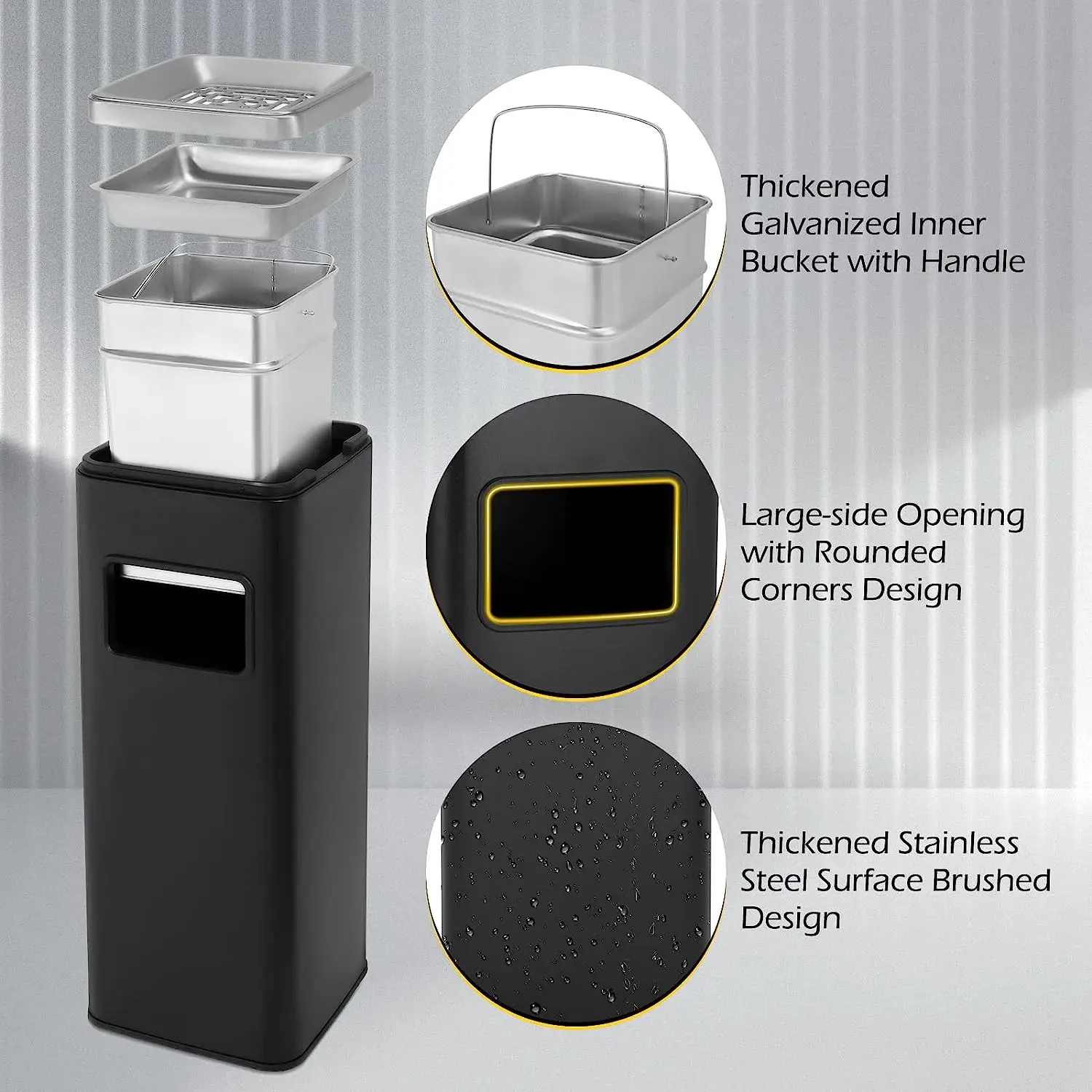 The square design of this metal trash can ensures enhanced stability, minimizing tipping risks especially in high-wind or busy pedestrian areas. The stainless steel construction not only ensures longevity but also offers versatility in customization, including logo and color options that support client identification needs. Its modular footprint facilitates easy arrangement alongside pathways and building entryways without obstructing traffic flow. Additionally, the corrosion-resistant surface withstands outdoor environmental stressors such as rain, UV exposure, and temperature fluctuations, preserving aesthetic and functional integrity over time. This design supports adaptability for various project specifications while maintaining cost-effectiveness and reliable supply chain sourcing from established trash can manufacturers.