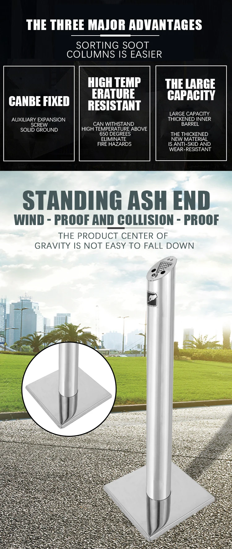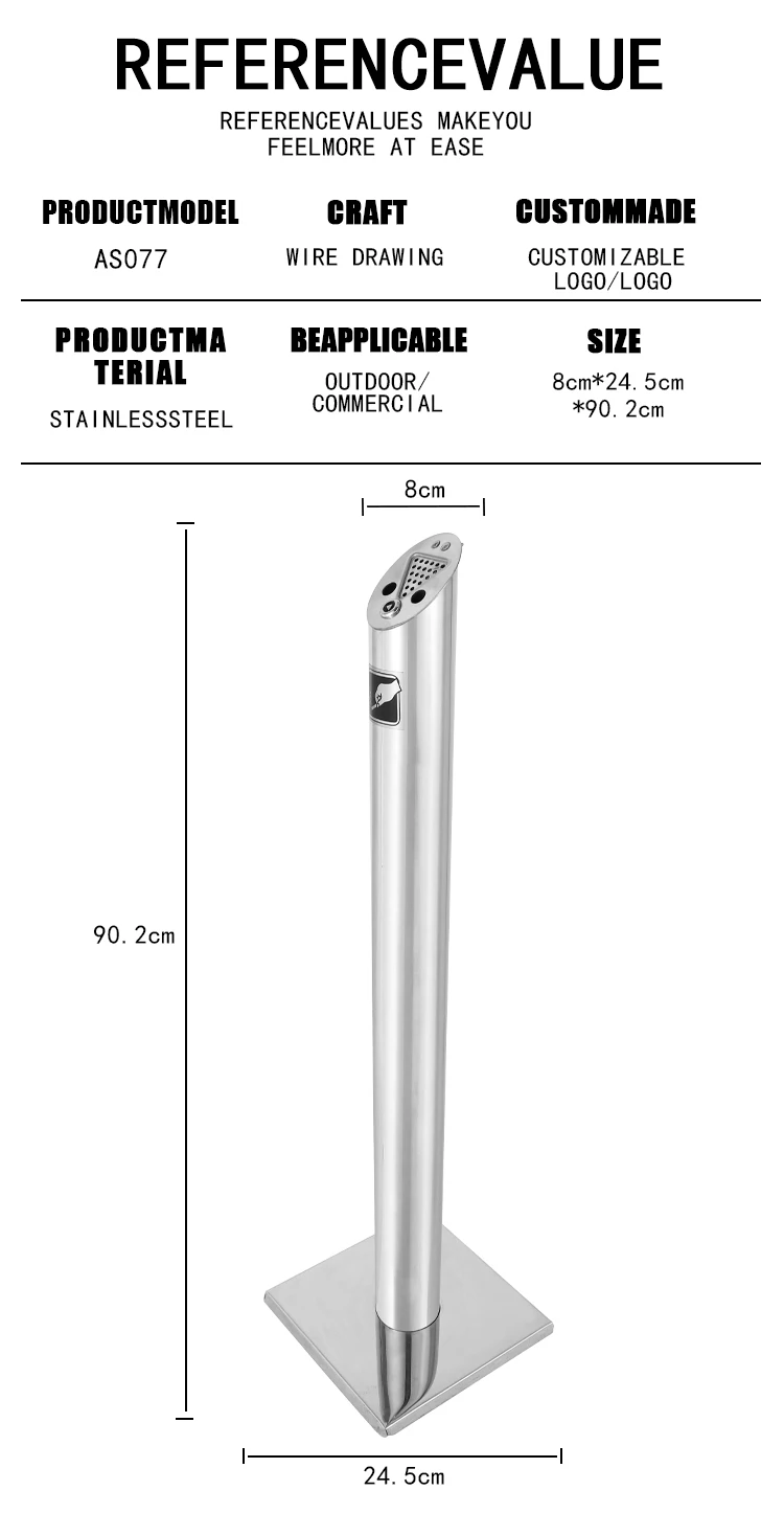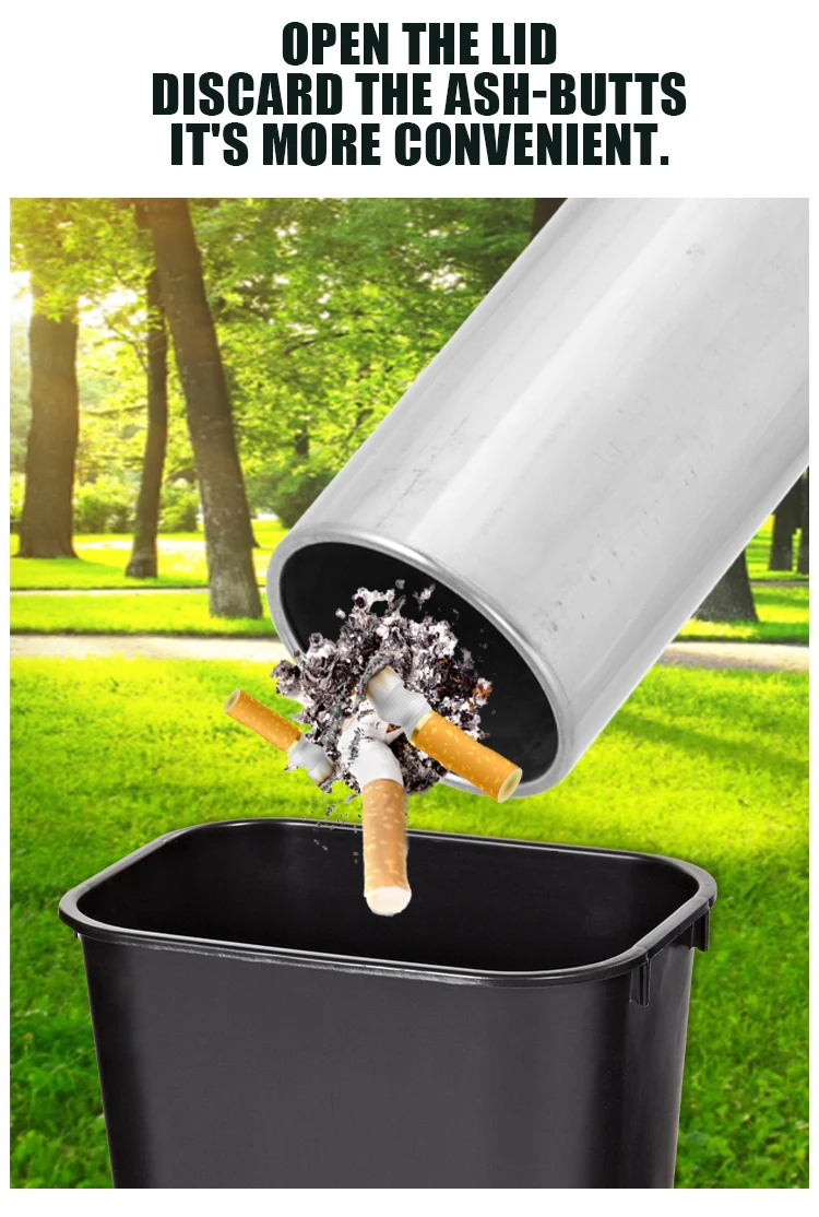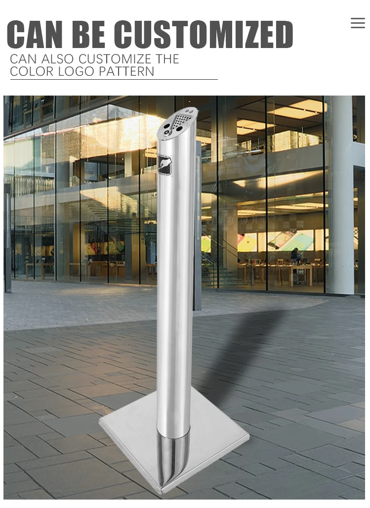 Durable and windproof floor-standing ashtray made of high-grade 304 stainless steel, featuring a classic round design. Ideal for hotels, restaurants, and public streets. Available in shiny or brushed finishes with customization options for color and branding.